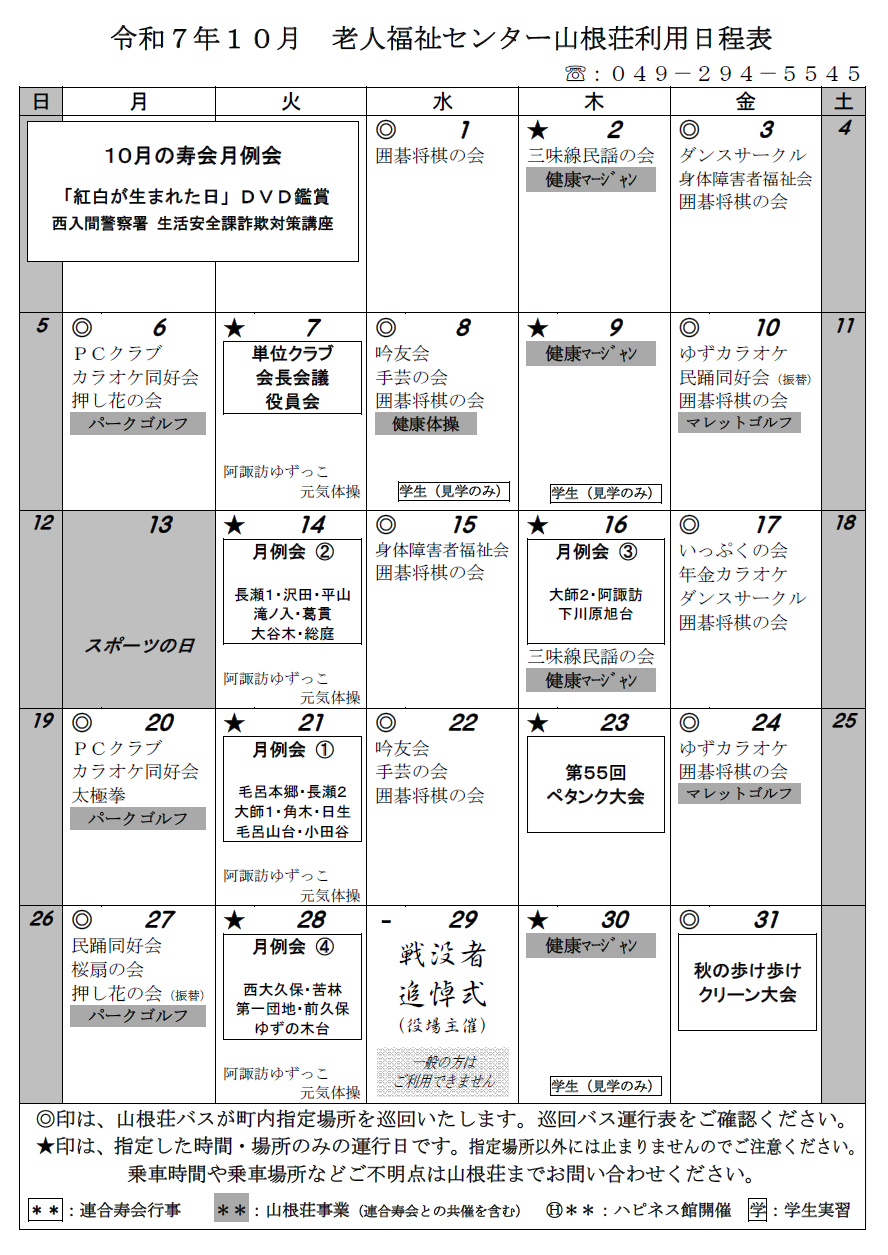 令和7年10月の利用日程表
